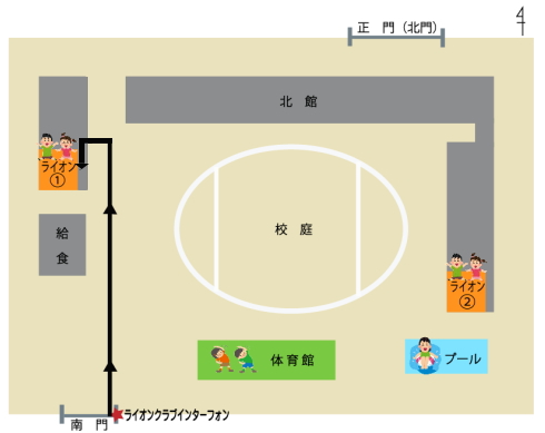| 児童は学校がある日、これまで通り学校が終わったらライオンクラブで過ごし、集団下校の児童は17時に正門(北門)と南門に分かれて下校します。それ以降は北門は使えません。 学校がお休みの日は、正門(北門)は使えません。8:30〜9:00まで30分の間、南門から登校してください。 保護者は正門(北門)は使えません。お迎え等でライオンクラブへお越しの際は、南門に設定されているライオンクラブインターフォンを押して、応答した職員にお子様の学年とお名前フルネームをお伝えください。電子錠を解錠しますのでその扉から入校してください。 |